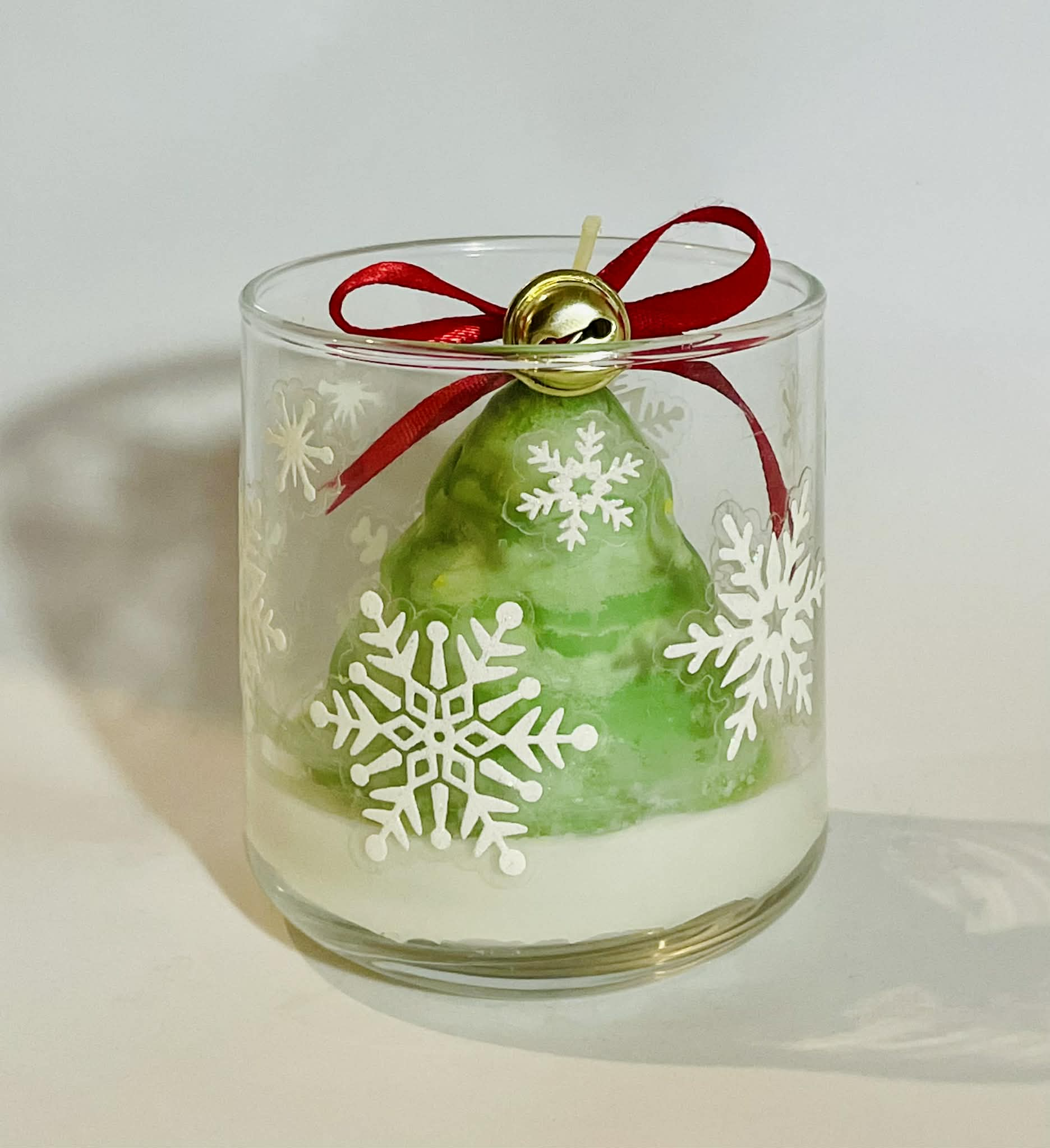 🎄Χειροποίητο αρωματικό κερί σε γυάλινο ποτήρι με χριστουγεννιάτικες νιφάδες, που κρύβει στο εσωτερικό του ένα πράσινο κερί σε σχήμα έλατου.🎄Διακοσμημένο με κόκκινο φιόγκο και χρυσό κουδουνάκι, προσφέρει ζεστασιά και γιορτινή ατμόσφαιρα στον χώρο. ✨ Με διακριτικό άρωμα βανίλιας🎁 Ιδανικό για χριστουγεννιάτικο δώρο